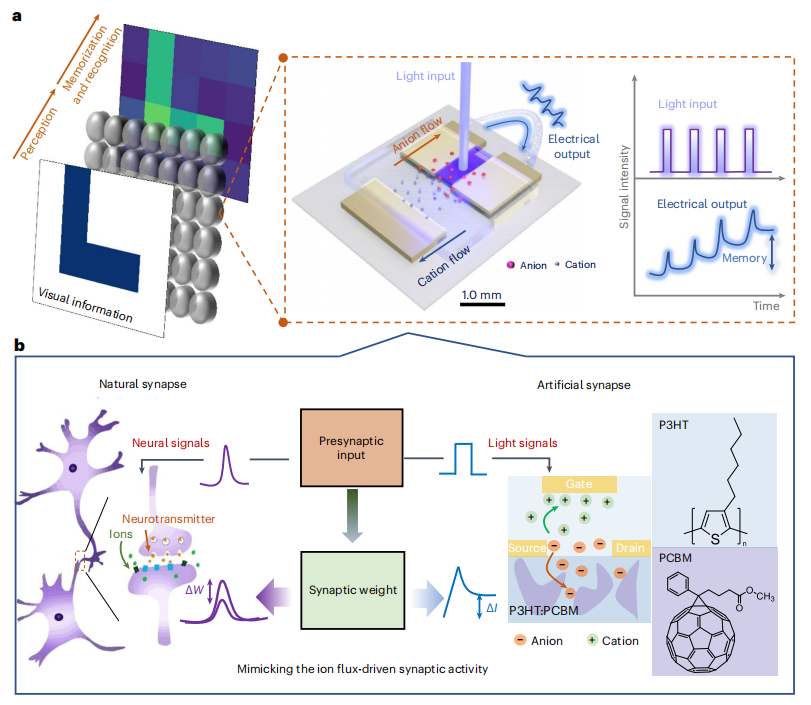 图1仿生视觉系统。(a) 具有图像感知、记忆和识别能力的人工视网膜示意图。(b) 生物突触示意图(左)和基于电化学晶体管的光电突触装置示意图(右)。在生物系统中(左),信号通过一种称为突触的连接在大脑神经元之间传递,突触前神经元的动作电位触发化学神经递质释放到突触后神经元,并导致离子流动。重复的信号对话调节突触连接强度(突触重量,∆W),这有助于人类对所感知的视觉信息的记忆。在电化学突触(右)中,光生载流子产生和离子输运导致非挥发性电流变化(∆I)。