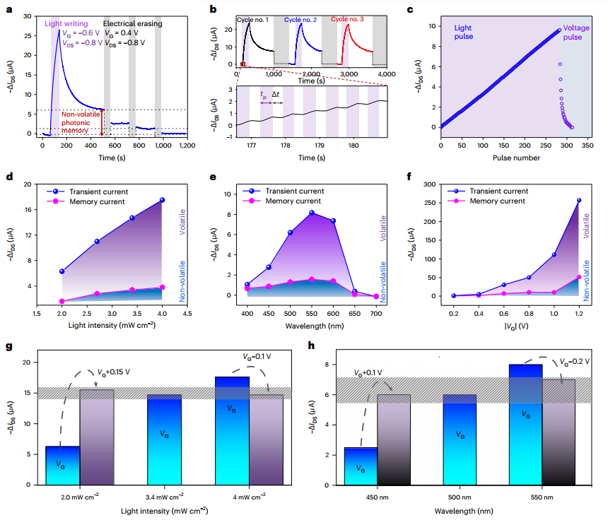 图2突触器件的光子非易失性。(a) 有光写入(紫色区域)和电压擦除(灰色区域)的器件的特征光子响应。(b) 三个有代表性的光存储器写入周期(VG =−0.6 V, VDS =−0.8 V)和电压擦除周期(栅极电压(VG) = 0.4 V,源漏电压(VDS) =−0.8 V)。在每次写入过程中,施加连续光脉冲(7.0 mW cm−2),持续时间(tp)为0.4 s,间隔时间(∆t)为0.23 s。放大后的视图显示了响应光脉冲的详细动态电流变化。(c) 采用缩短光脉冲(7.0 mW cm−2,tp = 0.04 s,∆t = 0.04 s)写入器件电流,实现高密度线性权值更新,并采用栅电压脉冲(VG = 0.4 V)擦除。(d) 光强调制光子响应。在关光后立即记录瞬时电流,300 s后记录记忆电流。(e) 光波长调制光子响应。 (f) 门电压调制光子响应(7.0 mW cm−2,60 s)。(g, h),通过调节栅极电压(VG),可以将不同光强(g)和不同光波长(h)(蓝色条)下的光子响应调制到所需的电平,以模仿人眼对不同照明条件的光学感应(紫色条)。VG =−0.6 v, VDS=−0.8 v。