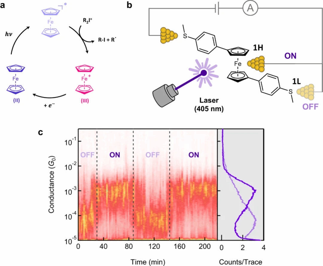 近日,美国哥伦比亚大学Latha Venkataraman教授报道了基于二茂铁衍生物在室温下形成的二茂铁基单分子器件,证明了可以使用光调控二茂铁的氧化而形成Fe-Au键,发展了室温下的金属-金属界面连接策略。该工作拓展了结接触化学的范围,为基于二茂铁的轻型可切换单分子器件奠定了基础,相关成果以《Photooxidation driven formation of Fe-Au linked ferrocene-based single-molecule junctions》为题发表在《nature communications》上。
