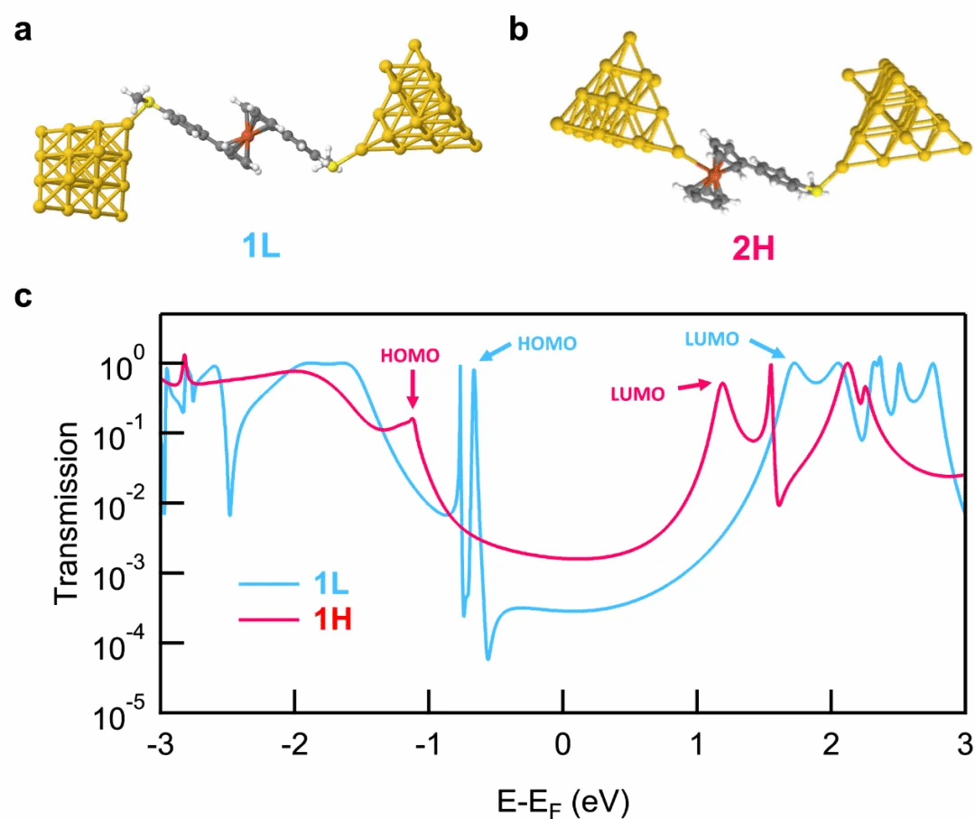 最后,作者对实验结果进行了DFT-NEGF理论模拟。对于Fe-Au键结合的分子,计算的结合能为0.8 eV,而通过Au-π轨道相互作用的分子,结合能仅为0.29 eV,说明二茂铁衍生物仅通过Au-π相互作用不太可能成结。为了将几何形状与电导相联系,作者使用NEGF对二茂铁衍生物结进行了电子传输计算。计算结果与实验结果一致,支持在氧化状态下生成Fe-Au键的假设。对于衍生物1L,其HOMO和HOMO-1轨道具有显著的破坏性干涉,会大幅度降低其在费米能级附近的电导;而对于衍生物2H,其前线轨道具有相反的相位关系,因此出现建设型量子干涉,导致费米能级附近电导升高。