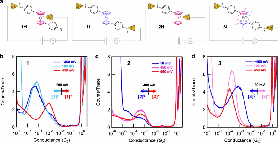 为了进一步证明电导的变化来源,作者使用电化学氧化还原方法进行了单分子电导测量。结果如图2所示:在低于氧化电位(280 mV)的电位下,在6*10-5G0处观察到清晰的电导峰;在450 mV的电位下,测得1*10-3 G0处的电导峰,与光氧化还原结果一致。考虑到snap-back长度,高电导的平台长度与S和Fe的距离一致(7.4 Å),表明测得的高导信号来源于一端通过Fe直接与金电极锚定的构型。
