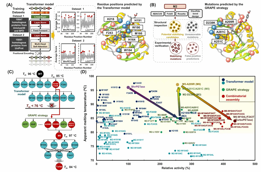 作者用大约26,000个PET水解酶的同源序列训练了两个数据集而得到了一个语言模型,并从进化的景观中预测了氨基酸残基变化的概率(图1A)。突变体构效关系的分析结果表明,降低酶最适催化温度引起了稳定性的下降,需要引入补偿性突变来抑制稳定性下降带来的不利影响。因此,作者采用之前设计的GRAPE策略,利用四种互补算法,即FoldX(力场能量函数)、Rosetta_cartesian_ddg(力场能量函数)、ABACUS(统计能量函数)和DDD(力场能量函数)来设计稳定突变(图1B)。最后获得的组合突变体TurboPETase相比于野生型BhrPETase,Tm从97 °C降低至85 °C,稳定性提高了3.4倍(图1D)。