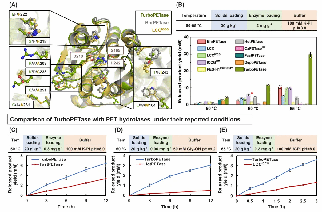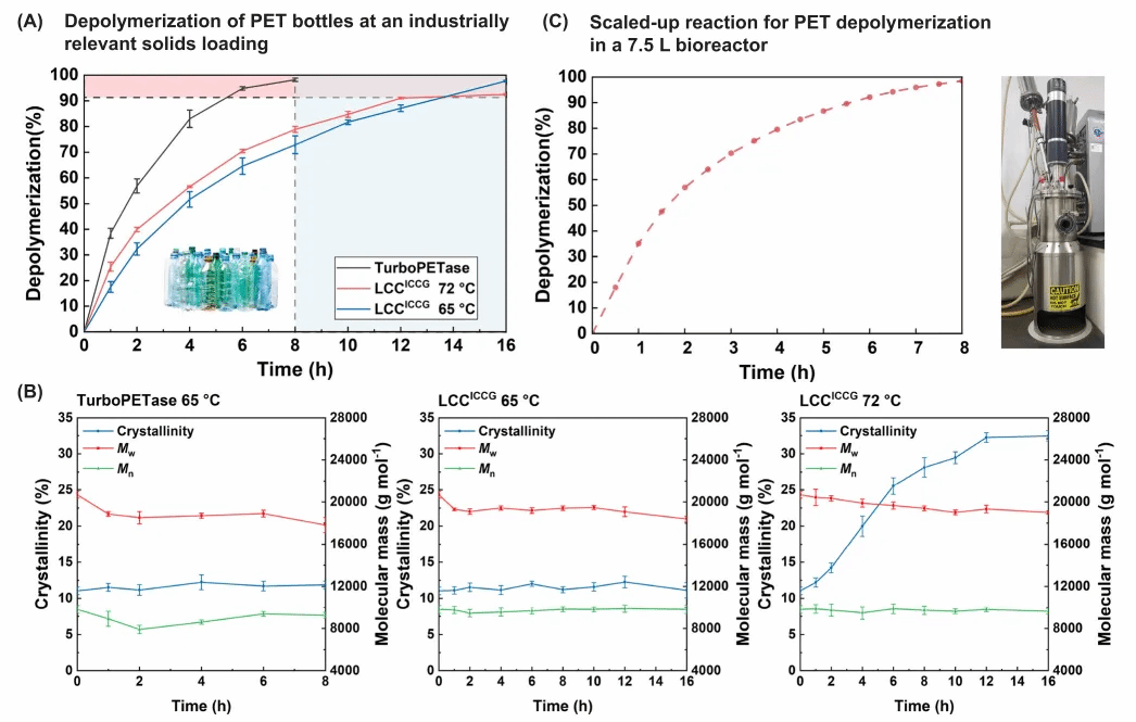 如图3所示,在高底物负载量(200 g kg-1)的情况下,TurboPETase能够在8小时内实现PET的几乎完全降解,最大生产速率为61.3 g水解PET L−1 h−1。而LCCICCG在65 °C下反应16 h只能实现97.7%的水解,72 °C反应12 h实现92.5%的水解,且剩下的PET结晶度分别为11.1%和32.5%。