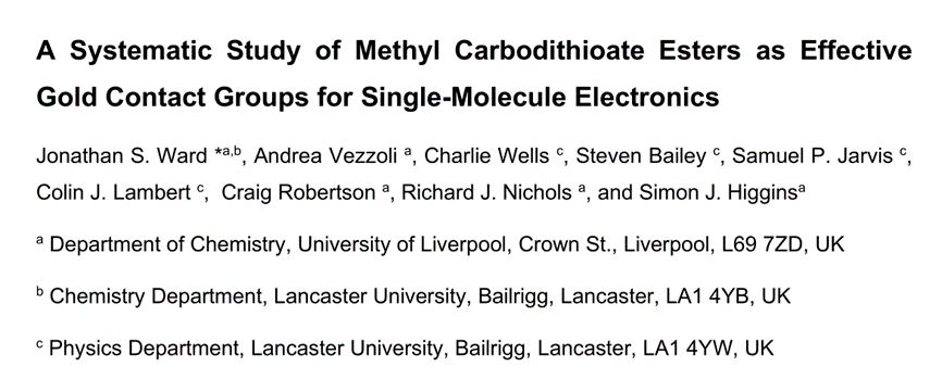 本文证明了甲基硫代甲酸酯基团在分子电子学中是一种优异的金接触基团。首先,通过STM-BJ测试,证明该基团具有极高的分子成结性。随后,将其与硫醚锚定分子的STM-BJ结果进行对比,发现甲基硫代甲酸酯基团能带来良好的电子传输特性,有助于提高单分子电子器件的导电性能。最后,通过核磁共振谱图,确认该基团在水和空气存在条件下具有良好的稳定性,并通过Raman/SERS谱图证明,即使在金属衬底存在情况下,基团也能够有效地与Au形成稳定的化学键。