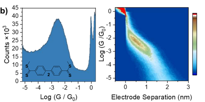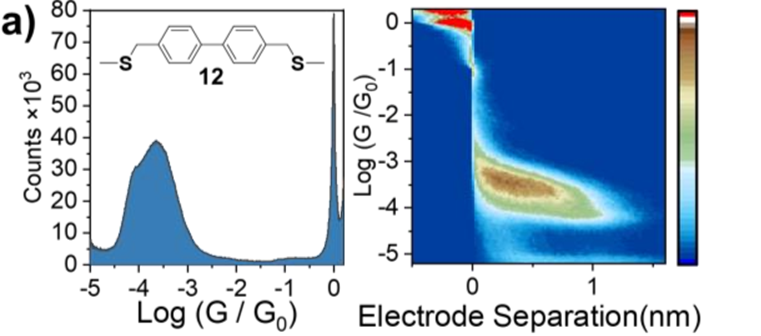 为了评估当分子长度相同时,甲基硫代甲酸酯中存在的C=S键带来的影响,作者制备了化合物12,其中的CH2有效的取代化合物2中的C=S键的位置。并与化合物2进行了对比实验。结果表明,相较于化合物12,化合物2的电导高了一个数量级,这说明甲基硫代甲酸酯基团具有良好的电子传输特性,有助于提高单分子电子器件的导电性能。