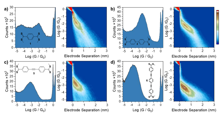 图2:扫描隧道显微镜-断裂结测试的电导一维,二维统计结果a) 1, b) 2, c) 5, d) 6溶于苯甲醚,1-2浓度为10 μM、5-6浓度为1μM