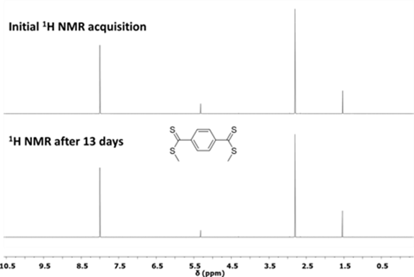 为了评估甲基硫代甲酸酯基团锚定分子的长期稳定性,将化合物1溶解在二氘代二氯甲烷(DCM-d2)中,对比新制备溶液和室温放置13天后的溶液。结果发现溶液颜色和透明度没有变化。为了进一步证明了甲基硫代甲酸酯基团的稳定性,进一步的1H NMR谱图对比显示,两种溶液的峰线没有拓宽,表明化合物1在氧气和微量H2O存在下具有良好的稳定性和抗氧化性。