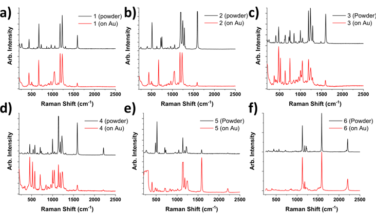 图5:化合物1 - 6在硅衬底上粉末、溶液(1 mM甲苯)的拉曼光谱
