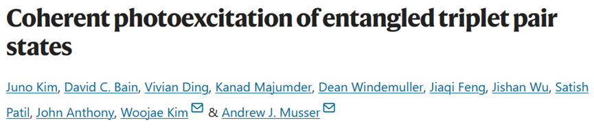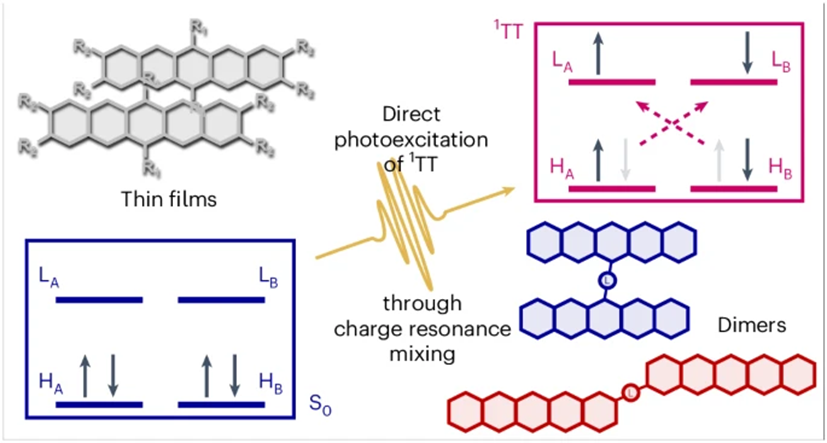 单线态裂分(Singlet Fission, SF)是一种发生在某些有机分子中捕获光子后的物理过程,形成单线激发态(S1)并转化成两个三线激发态(T1)。这个过程能够有效地将一个光子的能量转换成两个不易损耗的低能激子,从而增强太阳能电池的效率。单线态裂分的研究有助于我们更好地理解有机半导体中光物理过程,并且对于发展高效的光电器件具有重要的意义。SF的机理通常涉及到一个称为“纠缠三重态对”(1TT)的中间状态,这个状态本身是一个暗状态,意不直接与光发生相互作用。然而最近 Juno Kim等人发表于Nature Chemistry上的一项研究发现,基态分子是可以通过直接相干激发生成1TT,而不需要通过S1态的介导,并且分子间的强耦合则是实现纠缠三重态对的直接相干激发的关键。这意味着,通过适当的设计和选择材料,SF过程可以更加高效,并且有可能开发出新的策略来优化有机太阳能转换装置的性能。