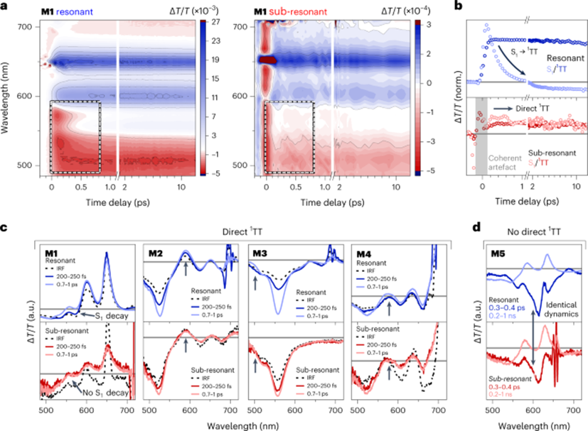 在薄膜M1至M4的分子间SF系统中,观察到了与二聚体中相同的直接激发形成1TT现象,但是在M5中却不存在这一现象。图3展示了单体薄膜在共振和亚谐振激发下的TA数据。在共振激发下,我们观测到从S1到1TT特征的明确转变,这与二聚体中的情况相似。然而,在亚谐振激发条件下,没有可解析的S1特征,只有瞬间形成的1TT特征。且图3b中的亚谐振动力学没有显示出任何状态转换的迹象,这也表明了单体薄膜样品中S0也是可以直接激发至1TT态。
