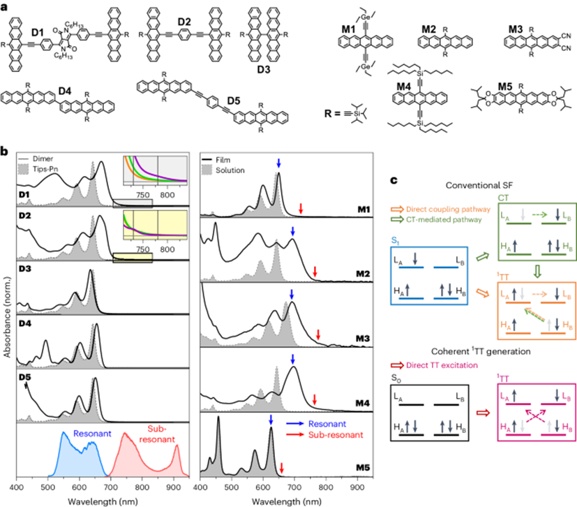 作者首先合成并表征了一系列从强耦合→弱耦合的并五苯衍生物,包括共价二聚体(图1a,D1-D5)和单体薄膜(图1a, M1-M5),并在图1b中展示了这些材料在不同条件下的稳态光谱特性。通过这些材料的稳态与瞬态光谱研究,作者证明了可以直接从S0相干激发成1TT态的可能性(图1c)。
