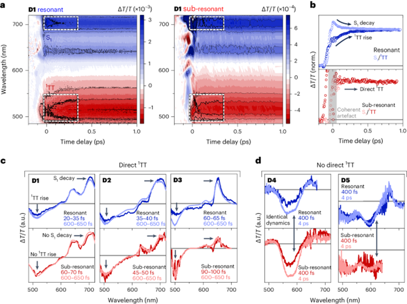 图2 (a) 在共振(左)和亚谐振(右)激发条件下D1的超快瞬态吸收轮廓图。白色的虚线框突出了在共振激发条件下,S1衰减和1TT增长的位置,而在亚谐振激发条件下,这些动态则不存在。(b) S1(700-720 nm)和1TT(500-520 nm)特征的归一化积分动力学曲线。(c) 指定时间延迟的D1-D3瞬态吸收光谱。(d) 指定时间延迟的D4-D5瞬态吸收光谱。