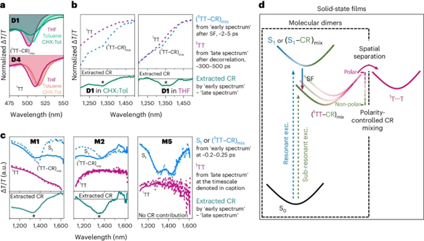 通过分析近红外区的TA光谱直接解析CR特性的贡献以理解这些特征。在二聚体SF发生后,1TT光谱在接近1,350 nm处产生一个峰,而该峰在1TT去相关过程中逐渐消失。在薄膜中SF之后的很长时间,所有样品在共振和亚谐振激发后的光谱精确匹配,说明无论激发路径如何都能达到相同的三重态1TT。有趣的是,亚谐振激发后的初始状态的光谱看起来像是1TT,但携带一个明显的附加带,这反而表明了CR的特性。正如先前所言,每当直接激发1TT时,此特征就会存在;但在D4、D5和M5中,主要光激发仍为S1时,则不存在此特征。