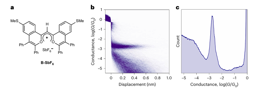 图5 蝴蝶状分子的单分子电导。(a)B-PF6的化学结构。(b)B-PF6 的2D电导直方图。(c)B-PF6的1D电导直方图。