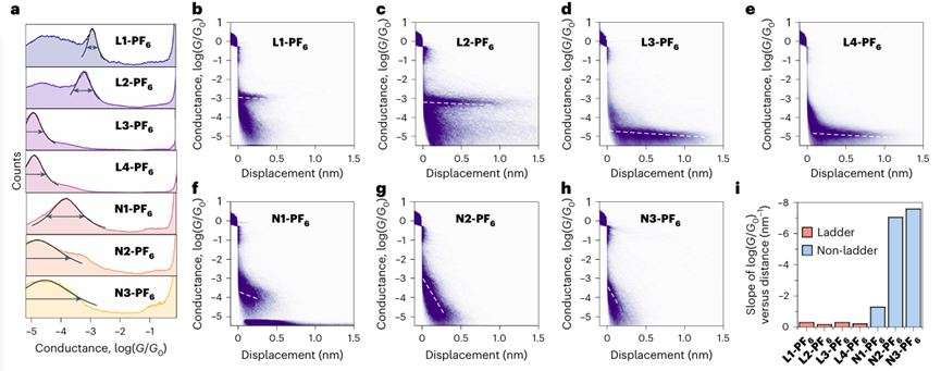 图2 梯形和非梯形分子的单分子电导。(a)梯形和非梯形分子的 1D 电导直方图。(b–h),L1-PF6 (b)、L2-PF6 (c)、L3-PF6 (d)、L4-PF6 (e)、N1-PF6 (f)、N2-PF6 (g) 和 N3-PF6 (h)白色虚线表示与最可能的电导值的拟合,作为结分离的函数(方法)。热图的色标在所有图中都是标准化的,以便进行比较。(i)从 STM-BJ 测量中 2D 电导直方图的线性回归拟合得出的斜率。所有数据均在 250 mV 偏压下获得。