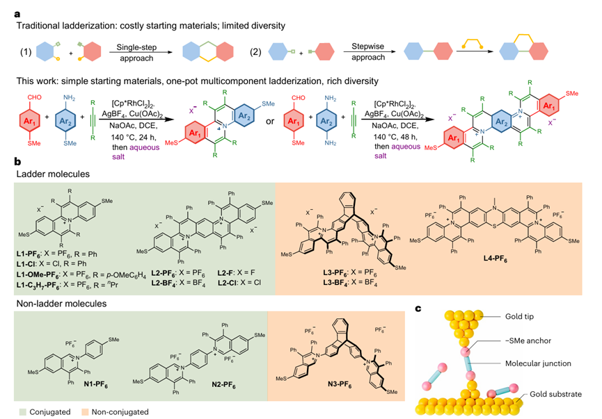 图1 单分子电子学的分子设计与合成。(a)传统梯形化方法(上图)与本研究中开发的一锅多组分梯形化方法(下图)之间的比较。Cp*,五甲基环戊二烯基;DCE,1,2-二氯乙烷。(b)梯子分子及其非梯子分子的化学结构。梯子用 L 表示,非梯子对应物用 N 表示。(c)STM-BJ 技术中分子连接的示意图。