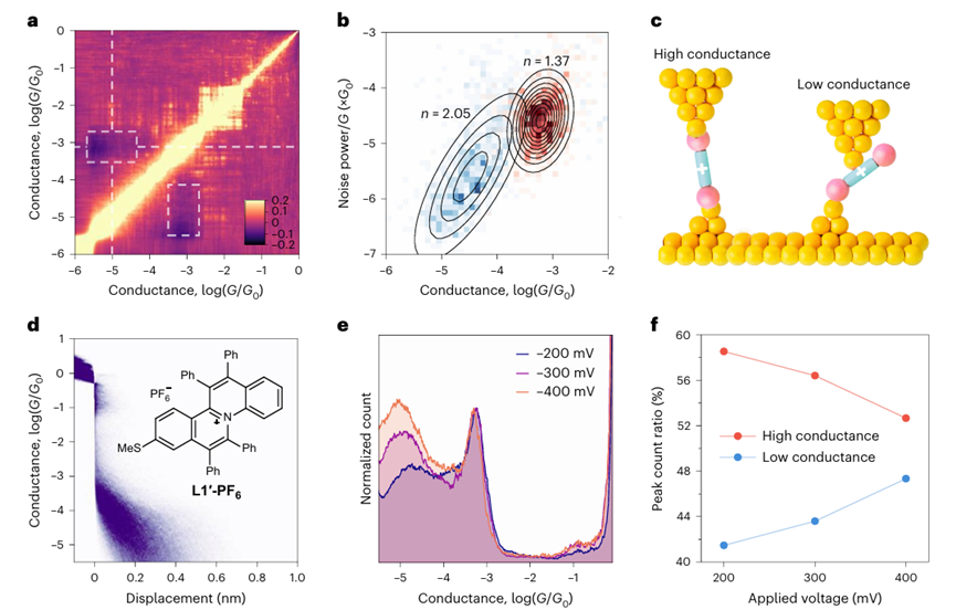 图3 梯形分子中电压调节的双电荷传输途径。(a) L2-PF6 单分子电导迹线的 2D 相关性分析。以 -3 log (G/G0)为中心的电导特征与以 -5 log (G/G0) 为中心的电导特征呈负相关。(b)分别对应于 L2-PF6 的高电导和低电导特征的分子亚群的闪烁噪声分析,这表明高电导和低电导特征存在through bond 和 through space电导通路(n ≈ 1.37 和 n ≈ 2.05 的缩放指数)。(c)梯形分子的结构象示意图,导致高电导和低电导电荷传输途径。(d)对照分子 L1′-PF6(插图)的 2D 电导直方图,仅包含一个末端 −SMe 锚。(e)在金针尖和衬底之间施加不同偏置电压的 L2-PF6 的 1D 电导直方图。使用高电导计数作为参考对计数进行归一化。(f)L2-PF6 中高电导和低电导状态的分子电导峰值概率比,作为应用偏压的函数。