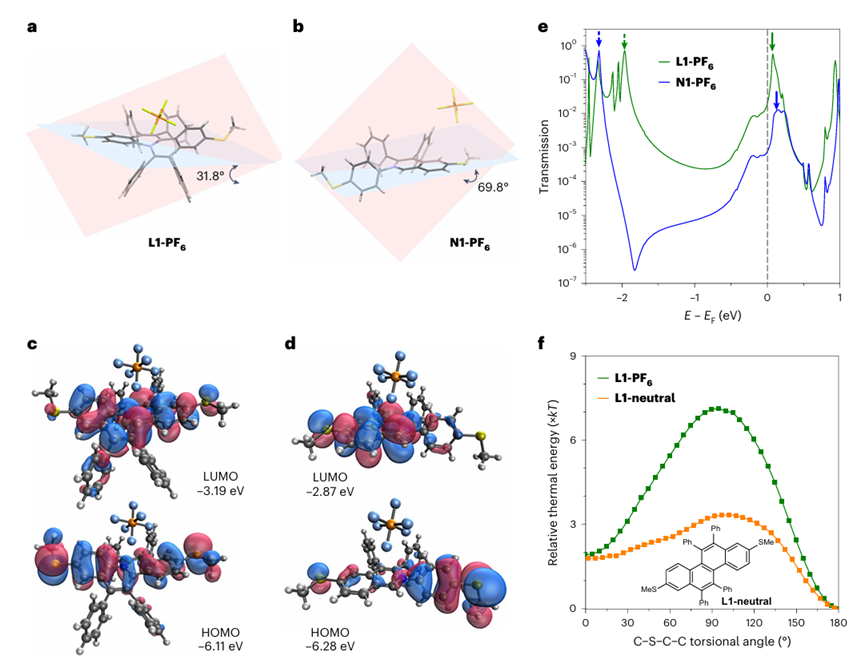 图4 结构和电子性能的比较分析。(a)单晶X射线衍射测定的 L1-PF6 的单晶结构。(b)单晶X射线衍射测定的 N1-PF6 的单晶结构。(c)使用 DFT 和 B3LYP/6-311+G(d, p) 测定 L1-PF6 的分子轨道。(d)使用DFT和B3LYP/6-311+G(d, p)测定 N1-PF6的分子轨道。(e)来自 NEGF DFT 模拟的 L1-PF6 和 N1-PF6 的传输计算作为能量 E 相对于费米能量 EF 的函数。(f)L1-PF6 及其中性类似物 L1-中性(如插图所示)的能量与 C-S−C-C 扭转角的函数关系。