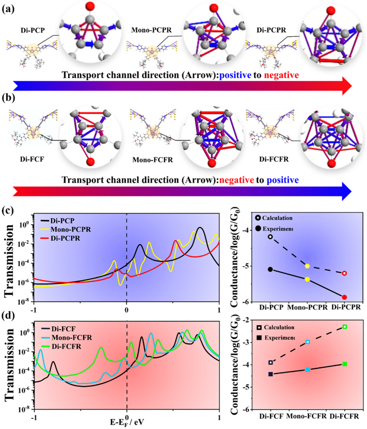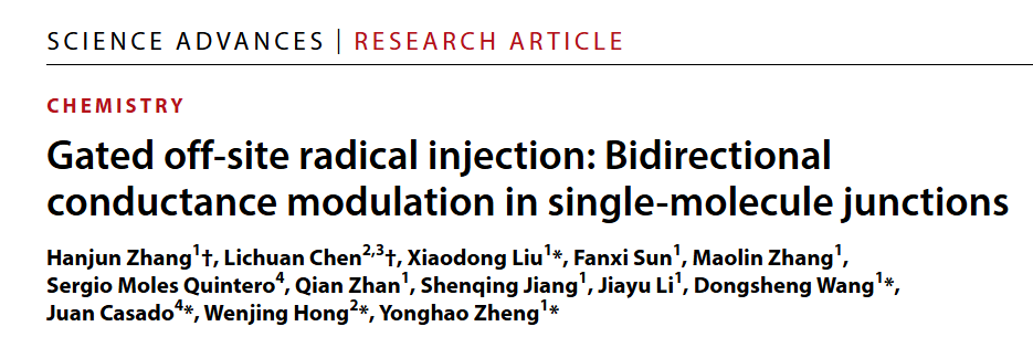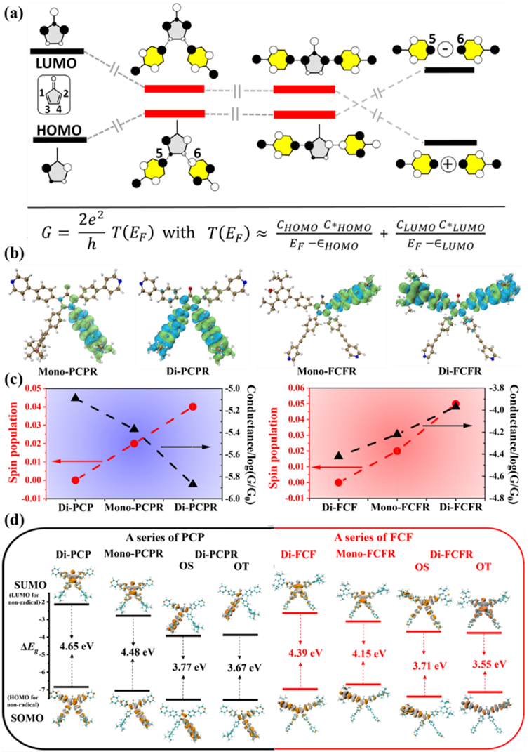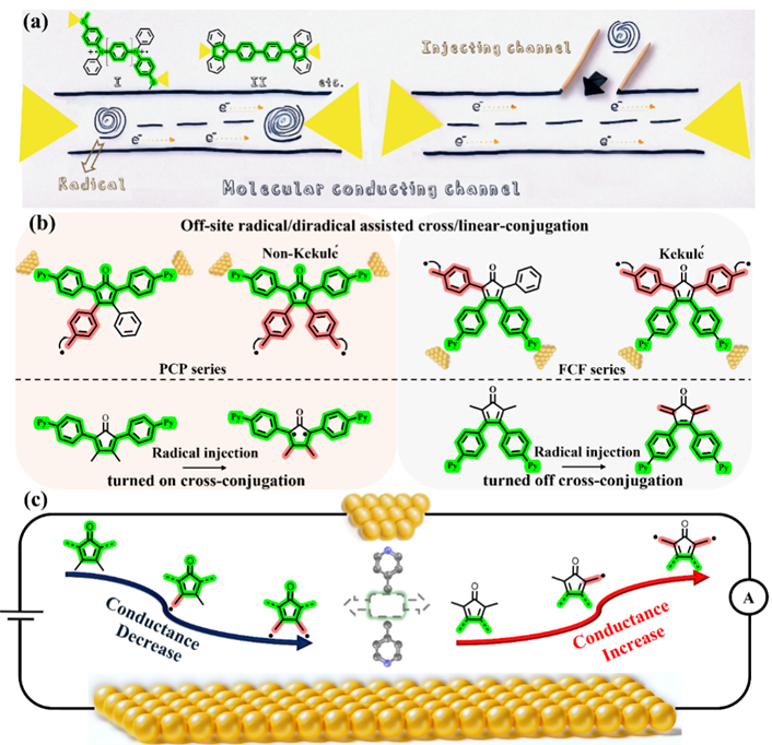 近日,电子科技大学光电科学与工程学院郑永豪团队与我们合作提出了一种新策略,利用非位点自由基来克服传统位点自由基注入的局限。利用两组环戊二烯酮衍生物,它们具有间位吡啶主导电通道和线性共轭(FCF)或交叉共轭(PCP)的间位自由基路径。使用扫描隧道显微镜断裂结技术(STM-BJ),我们发现,与闭壳层PCP相比,在PCP体系中注入单自由基和双自由基降低了分子的导电性;而FCF体系则呈现相反的趋势。
