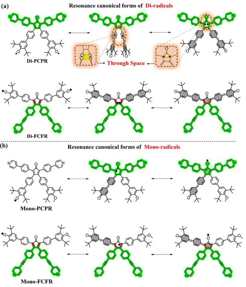 作者以环戊二烯酮为基础设计合成了自由基前体Di-PCP, Di-FCF, Mono-PCP和Mono-FCF, 以及通过氧化产生的单自由基Mono-PCPR和Mono-FCFR和双自由基Di-PCPR和Di-FCFR,并通过电子自旋共振(ESR)光谱确认自由基的存在。