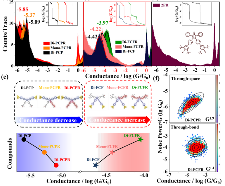 作者通过STM-BJ 设备在室温空气中测量了非自由基前体、单自由基和双自由基的单分子导电性。研究发现,PCP系列分子的导电性在引入自由基后降低,而FCF系列分子的导电性则提高。通过噪声功率谱分析,我们发现PCP系列的导电性主要是through space 输运机制,而FCF系列则主要是through bond 输运机制,这与前面分子的自由基离域造成的共振和反共振特征相一致。这些结果揭示了自由基在调控分子导电性中的作用,对于理解分子电子学中的电荷传输机制具有重要意义。