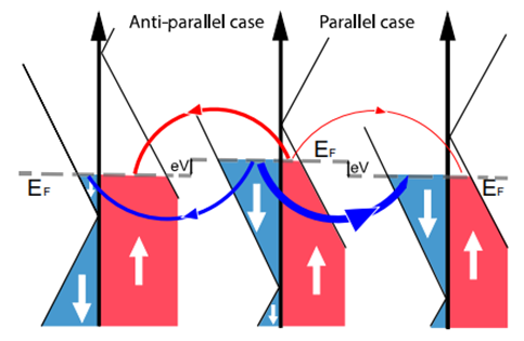 最后该文提出了一种由磁性异质结构石墨烯制成的静电控制隧道结。高电阻(“反平行”)情况在图6左侧,而低电阻(“平行”)情况在右侧。箭头的厚度表示自旋向上(红色)和向下(蓝色)的隧穿电流的大小。在石墨烯层之间施加静电偏置电压,以实现高电阻和低电阻状态。