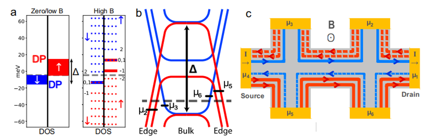 图3 磁化石墨烯中交换位移态密度、朗道能级和逆流边缘沟道。(a)左:0 T下Δ=27 meV时磁化双层石墨烯的自旋向上极化空穴(红色)和自旋向下极化电子(蓝色)态密度,交换偏移狄拉克点被标记为DP,费米能级(灰色虚线)位于两个载流子区间,对应Vg-Vg0 = -1.3 V,右:2.2 T下Δ=27 meV时双层石墨烯的朗道能级,蓝线和红线分别对应于电子和空穴朗道能级,实(虚线)线是被占据(未被占据)的能级,箭头指示自旋状态。(b)样品接触点3和2,5和6 接触的朗道能级空间色散和边缘态化学势。(c)共存的自旋向下的电子(蓝色)和自旋向上的空穴(红色)量子霍尔边缘通道。