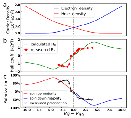 通过实验提取的自旋极化随栅极电压变化的情况,以及理论模型与实验数据的对比。图5a显示了载流子密度,当Vg<Vg0对应于空穴自旋向上多数状态,为正自旋极化。类似地,Vg>Vg0对应于电子自旋向下的负自旋极化。在电子和空穴相等的电荷补偿点,即Vg=Vg0时,极化为零。图b显示了计算与实验得到的霍尔系数,提供了自旋极化的直接测量。如图5c所示,当移出双载流子区|Vg-Vg0| > 4.5 V时,电子和空穴的自旋向上和向下密度增加,从而导致在大的正/负栅极电压下自旋极化下降.。说明通过栅压可以静电调节控制载流子的密度,从而实现从+69%和-50%之间自旋极化。