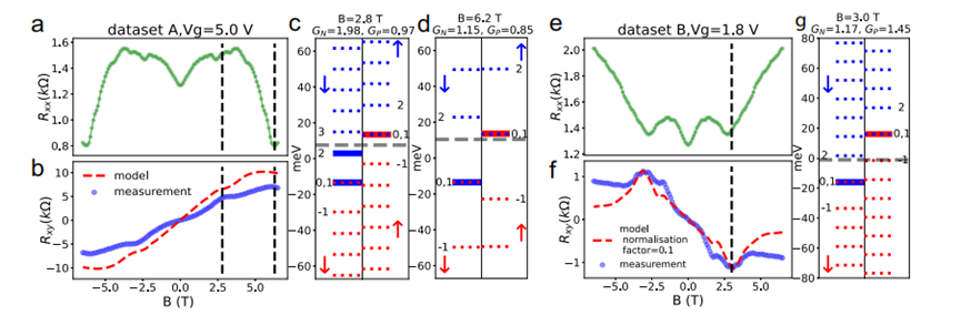 通过以上理论模型的建立,分析霍尔系数和载流子密度的关系,研究人员将理论模型与实验结果进行了比较,发现模型能够很好地解释实验中观察到的电阻特性。在电荷补偿点附近,纵向电阻的斜率从负变正,而横向电阻的斜率则相反。此外,纵向电阻在低磁场下不随栅极电压变化,这被解释为交换偏移导致的载流子密度与栅极电压无关。
