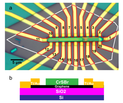 图1 设备的结构。(a)双层石墨烯-CrSBr器件的光学显微图。白色的轮廓是脱落的石墨烯薄片覆盖的区域,红色的轮廓是多余石墨烯蚀刻后的石墨烯霍尔条几何形状。中间的绿黄条是CrSBr薄片,它的颜色不均匀是由于其表面的不规则。(b)器件的横截面:显示了由二氧化硅绝缘层与器件分离的掺杂硅背栅。