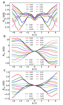 图2 在不同栅极电压下,纵向电阻(Rxx)和横向电阻(Rxy)随磁场变化的情况。(a)触点9和6之间的Rxx作为栅电压的函数。(b)触点10和12之间的Rxy作为栅电压的函数。(c)触点8和14之间的Rxy作为栅电压的函数。
