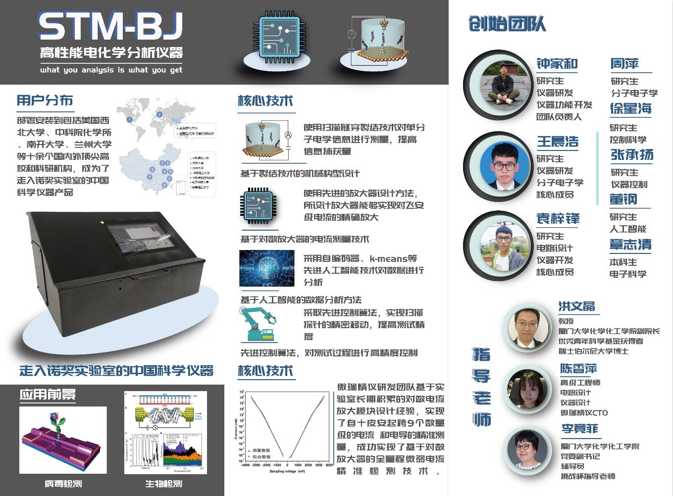 该团队参赛课题是面向纳米尺度半导体表征的精密科学仪器研发,该项目通过在机械结构系统、放大电路系统和数据采集与处理软件系统上的创新研开发出一台具备高灵敏度、高选择性识别、高时空分辨率和飞秒级高速检测的便携式单分子电学性质表征仪器,实现了对分子结中电子输运行为的超高灵敏度表征分析,在探究目标分子独特的电输运特性方面和基于该技术的智能工业分析测量领域方面均具有广泛的前景,整个设计新颖,构思巧妙,紧扣当前时代热点,突出了服务于基础科学研究和商用分析检测领域了巨大优势。