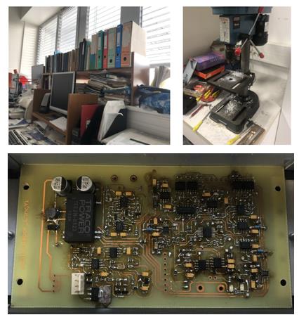大神极简单的办公环境,见到我的第一天就拿出4本书,告诉我学习也是要时常啃啃大部头书,补充知识储备,当然动手能力也是相当重要。在Gabor的小作坊里所有的东西都是纯手工打造(比方说台钻..我这个小肥手根本控制不住= =),这样的操作对我这种在国内直接送厂制造的小朋友来说难度很大。一次在电路板上安装插件,他指导我要非常非常小心,用一点点力气,我非常非常小心的撬了40分钟毫无进展,Gabor终于忍不住走过来告诉我你要用点力啊= =。(我跟1.9米的大汉,对使用非常小力的理解总是出入辣麽大.)Gabor给我的指导是一步一步的,刚开始的时候从摸索绘图软件,之后理解原理图设计原理图,到绘制PCB电路板,制造PCB电路板,焊接元器件到最终的调试。所有的设计都是反反复复修改,一点一点完善出可以工作的版本。有时候我担心项目进度,他总是告诉我”slow but stable”,我们一步一步从最基本的模块设计对数电流电压转换器,总共设计了三个版本。感谢Gabor带着我不断debug,给我耐心的指导与帮助。