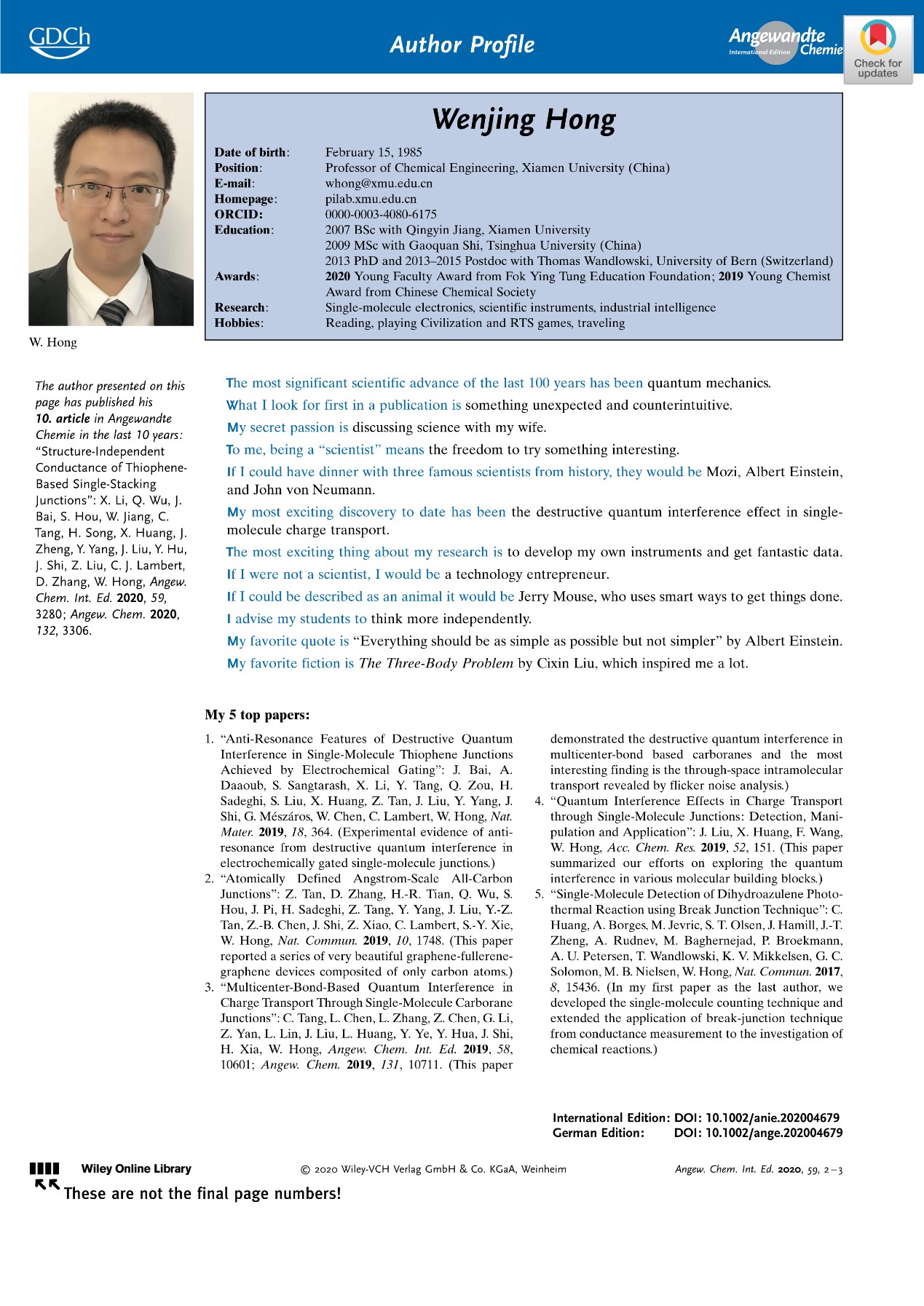近日,化学领域世界顶级期刊《德国应用化学》“Author Profile”专栏对Pi-Lab洪文晶教授进行了人物专访介绍(Angew. Chem. Int. Ed. 2020, 59, 2, DOI: 10.1002/anie.202004679)。该栏目每期均会邀请在过去10年内在该期刊累计发表10篇以上原创性科研论著的学者,以对话方式分享他们的学术心得和生活趣事。
