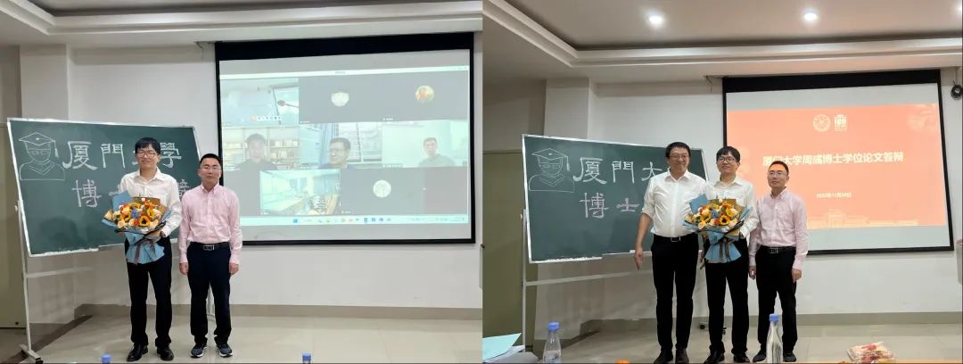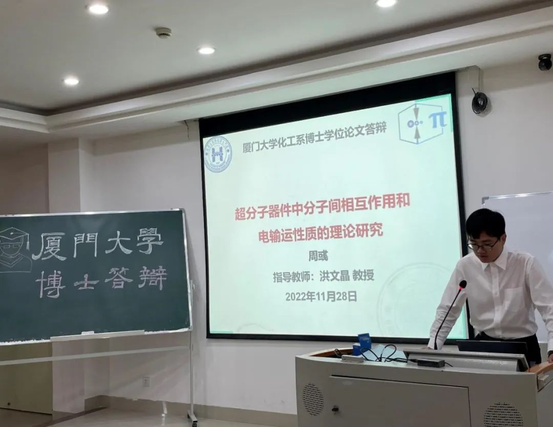 2022年11月28日下午,在厦门大学思明校区化学楼601举行了课题组2019级博士生周彧的博士学位论文答辩会。由于疫情防控需要,本次会议采取线下和线上同时进行。厦门大学萨本栋微纳米研究院杨扬教授担任答辩委员会主席,北京大学信息科学技术学院侯士敏教授、湖南大学物理与微电子科学学院陈克求教授、燕山大学理学院田广军教授、天津大学理学院于曦教授担任答辩委员会委员,厦门大学化学化工学院李薇老师担任答辩秘书。