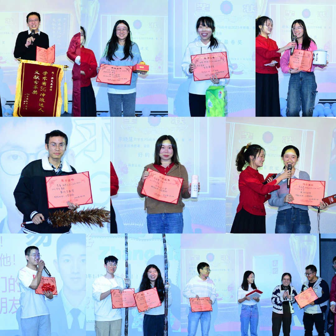 晚会第二环节,在主持人风趣幽默的介绍下,师生们一同回顾了过去一年的精彩瞬间。接着为多位“π-lab之最”颁发了一系列特别的奖项和奖品,包括“文献分享奖”—我们的W教授、“年度最卷奖”--仉花师姐、“机时手速奖”-王佳师姐、“好的老师奖”—李晓慧师姐、“最佳后勤奖”—李康师兄、“人民公仆奖”—赵永杰师姐、“强国有我奖”—季淑蕊师姐、“行者孙奖”—叶靖瑶师姐和张浩师兄、“新人王奖”—易洋同学、“百年好合奖”—卫彩云师姐、李紫芹师姐、周彧师兄,希望小伙伴们在接下来的一年各放异彩,绽放出属于自己的独特光芒!