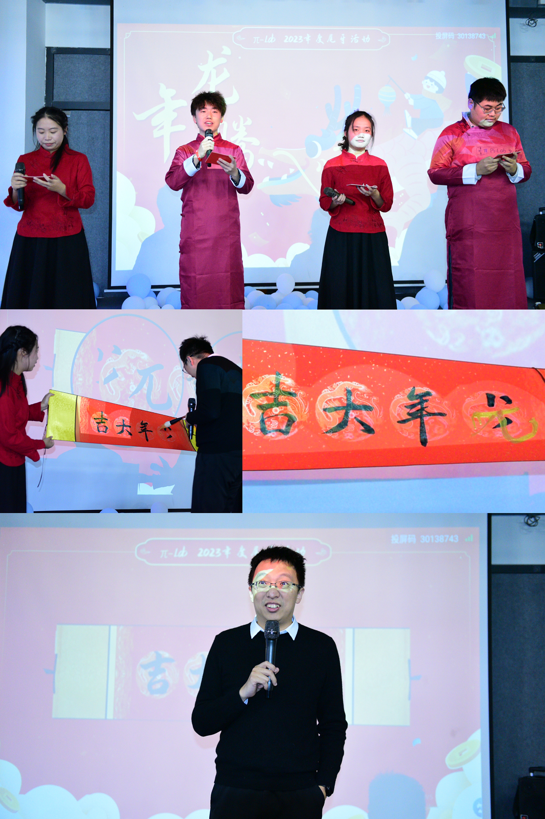 傍晚时分,π-lab尾牙晚会正式拉开序幕。洪文晶老师首先发表开场致辞,他回顾了π-lab在过去一年中所取得的显著成果,对所有成员的辛勤付出表示感谢,并希望大家在2024年能够继续努力、勇敢而坚定地去追求梦想。随后,他以亲笔补全横批“龙年大吉”中的“龙”字,巧妙地将“π”字融入其中,寓意着π-lab新一年的美好开端。