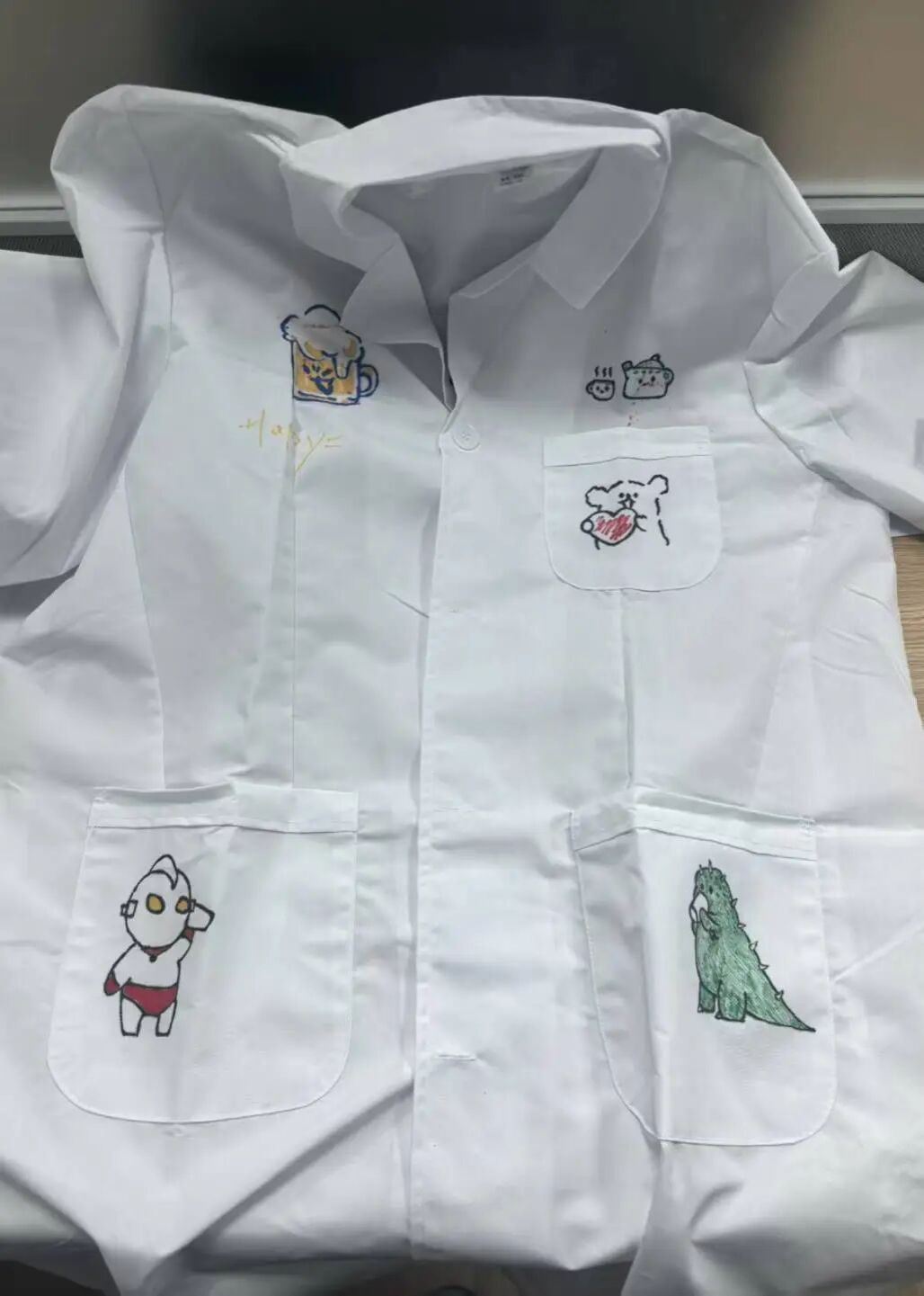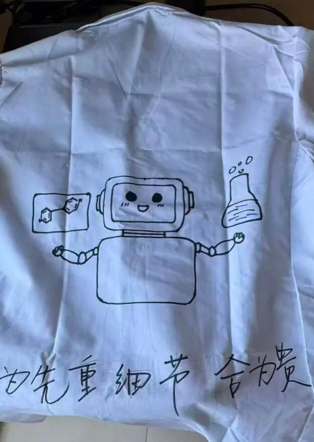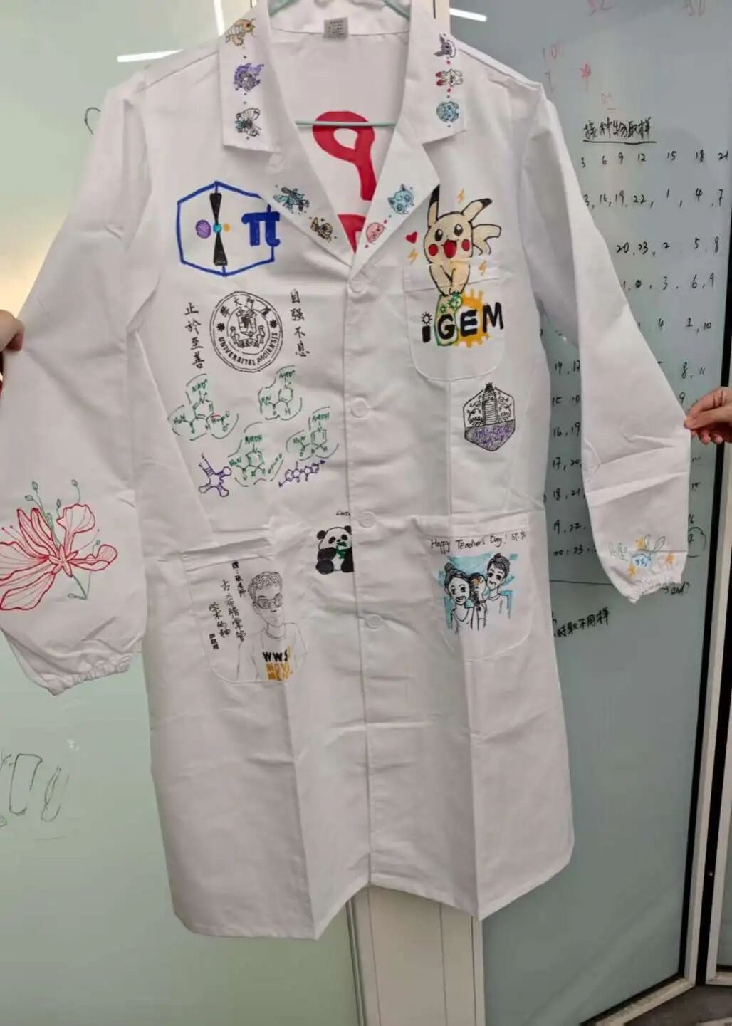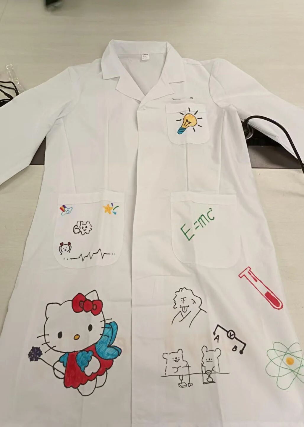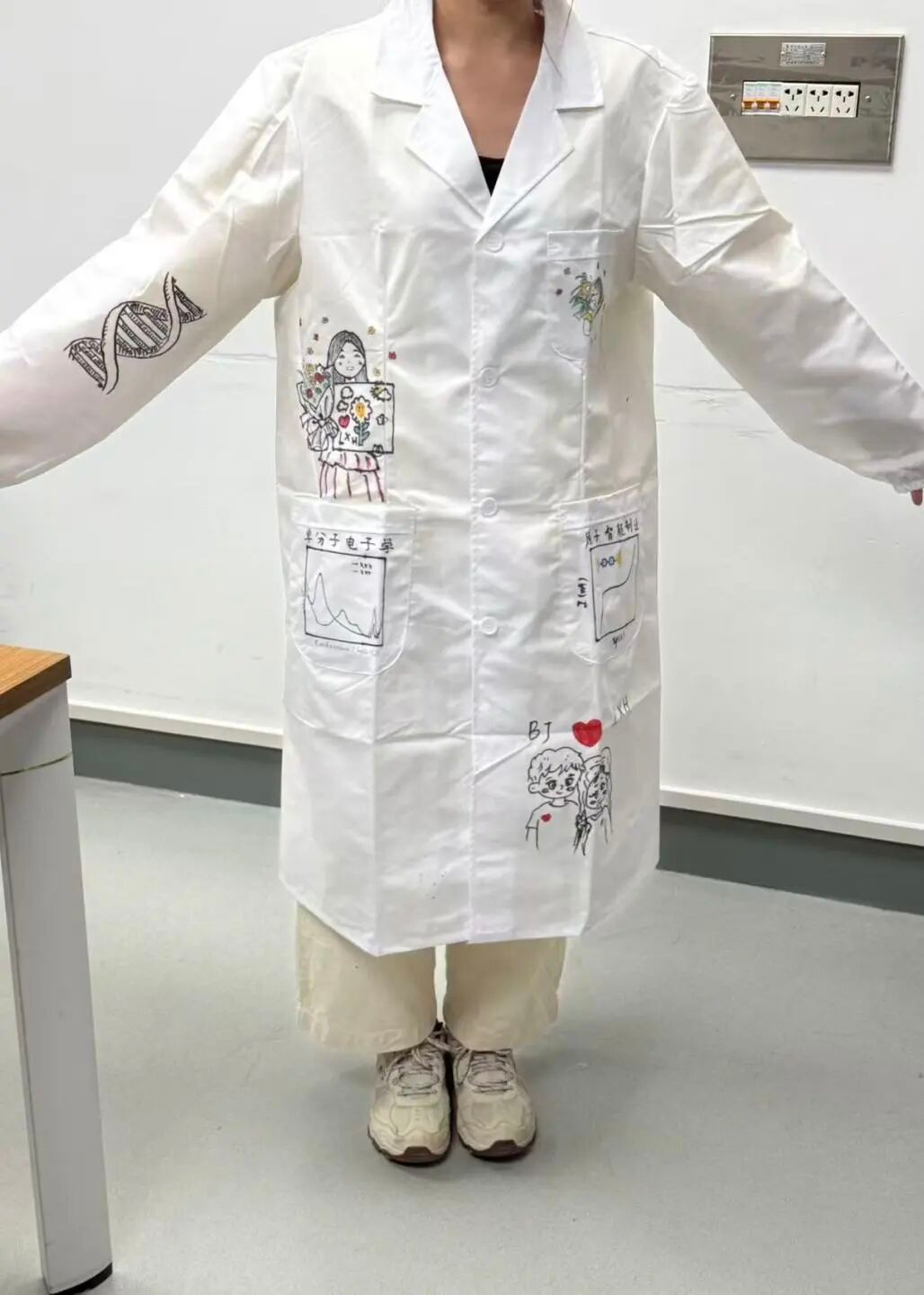 同学们拿起画笔,将老师的谆谆教诲、科研路上的点滴感悟,化作一个个充满创意的图案。同学们根据每个老师的特点以及兴趣爱好,为每位老师定制了不同的“战袍”,让每一件实验服都成为老师的"科研名片"。
