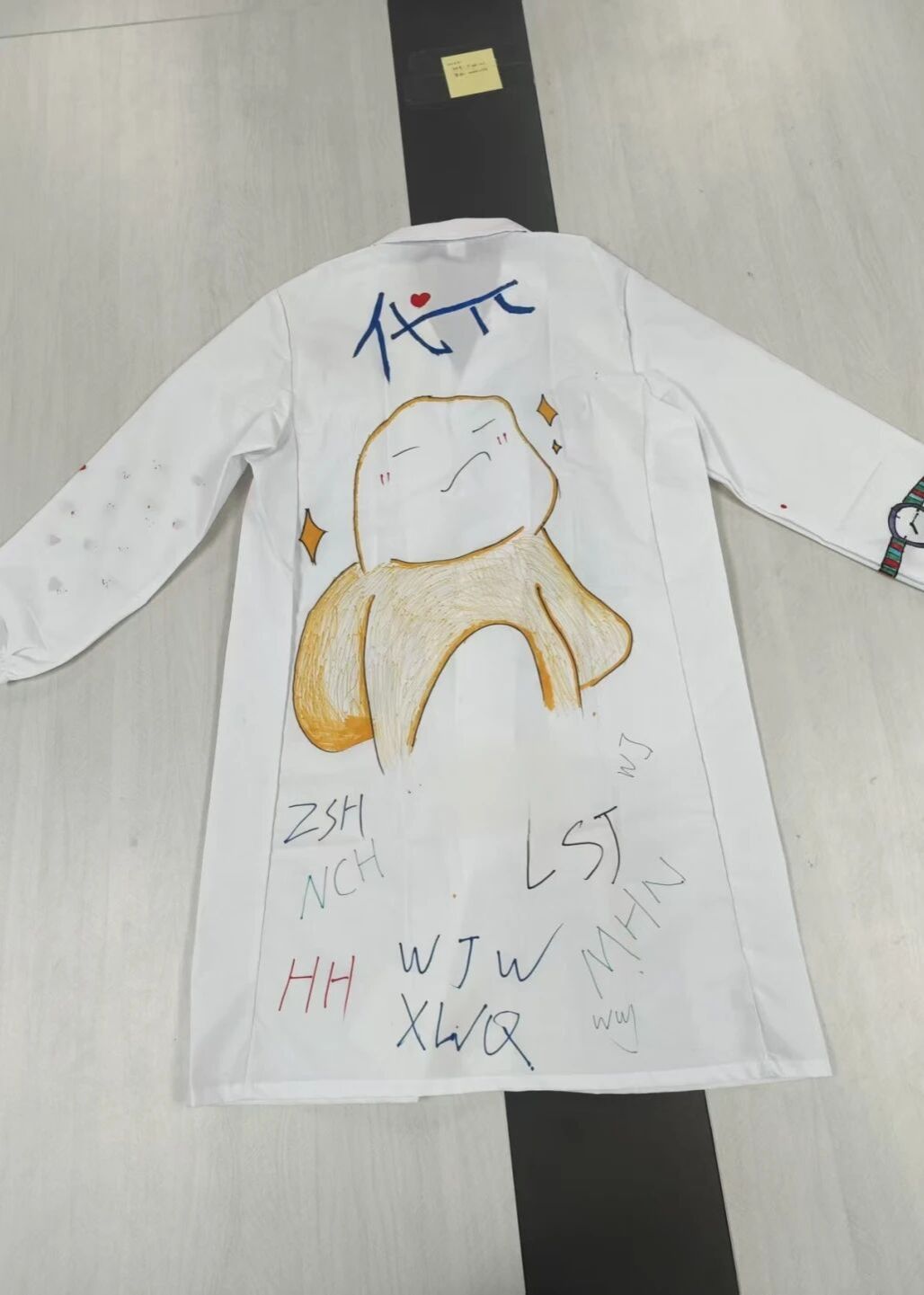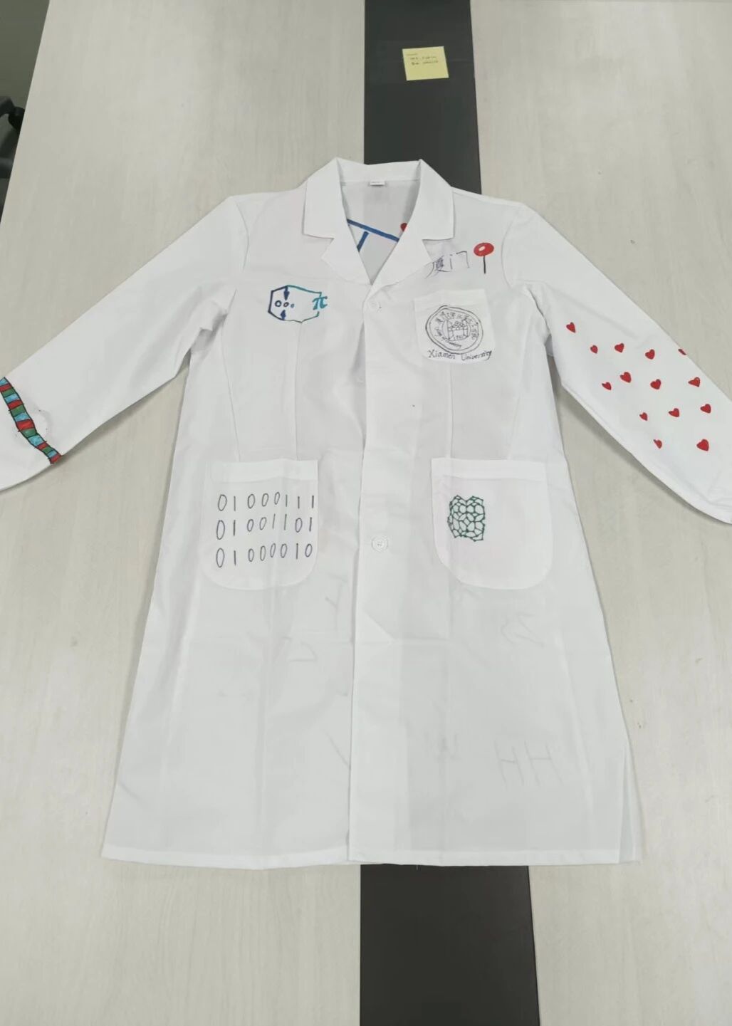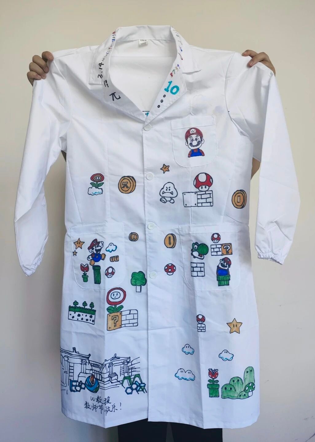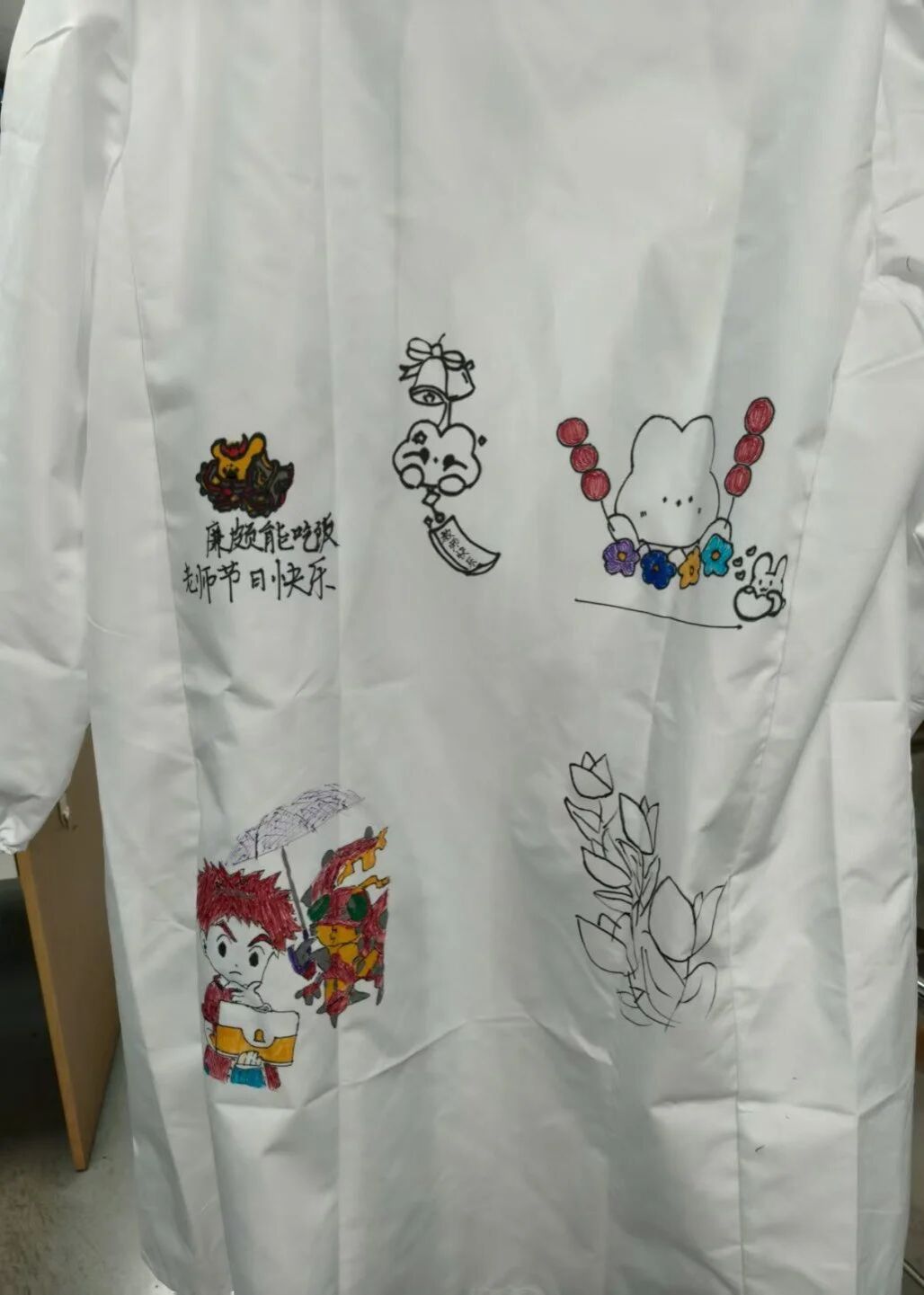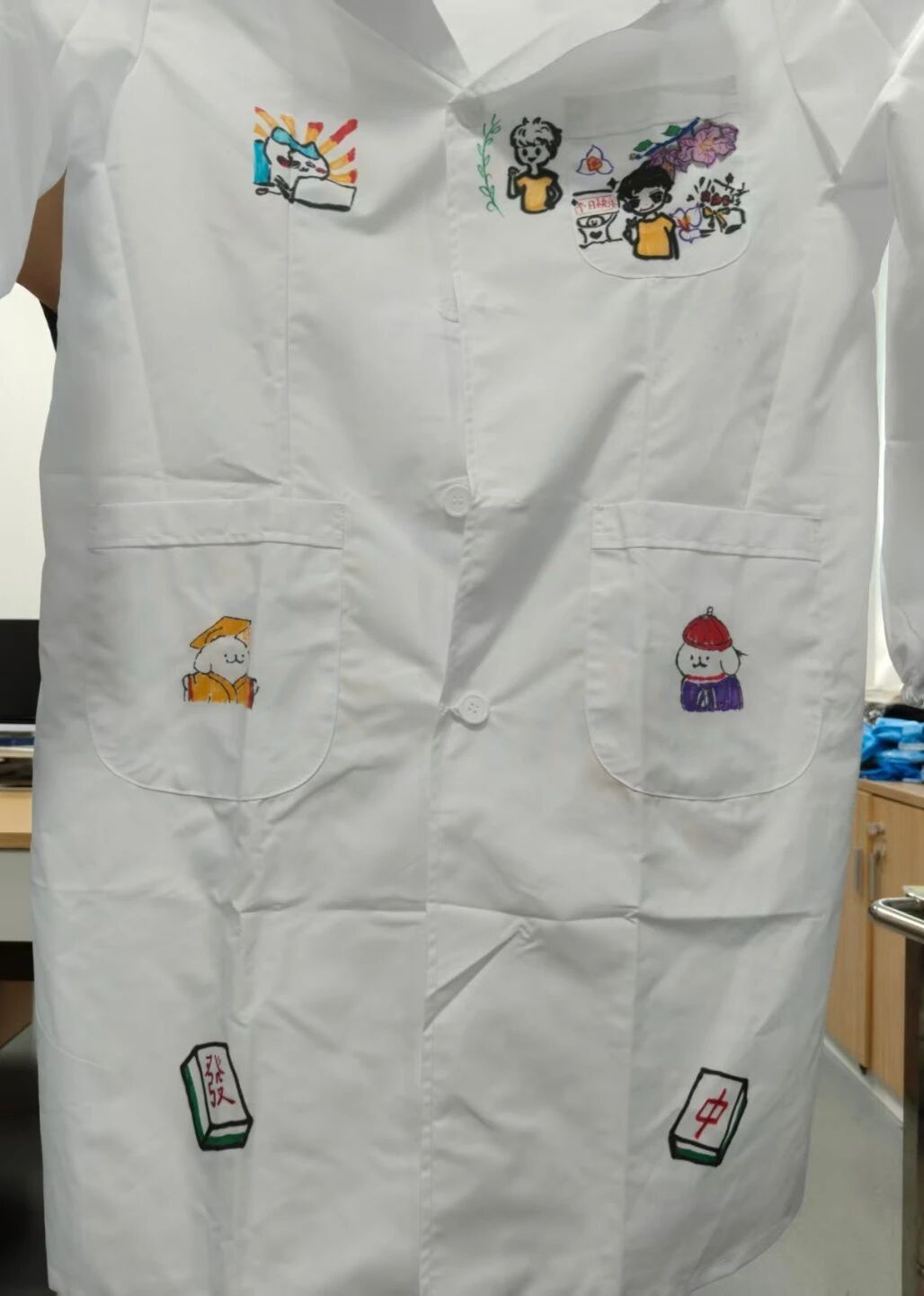 同学们拿起画笔,将老师的谆谆教诲、科研路上的点滴感悟,化作一个个充满创意的图案。同学们根据每个老师的特点以及兴趣爱好,为每位老师定制了不同的“战袍”,让每一件实验服都成为老师的"科研名片"。