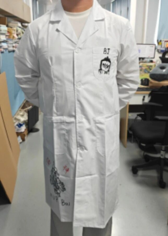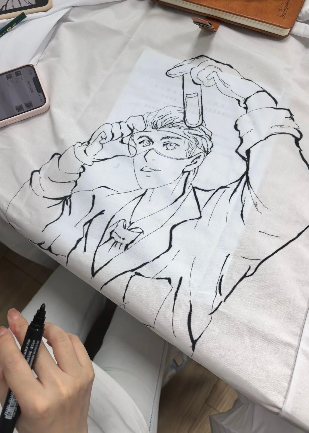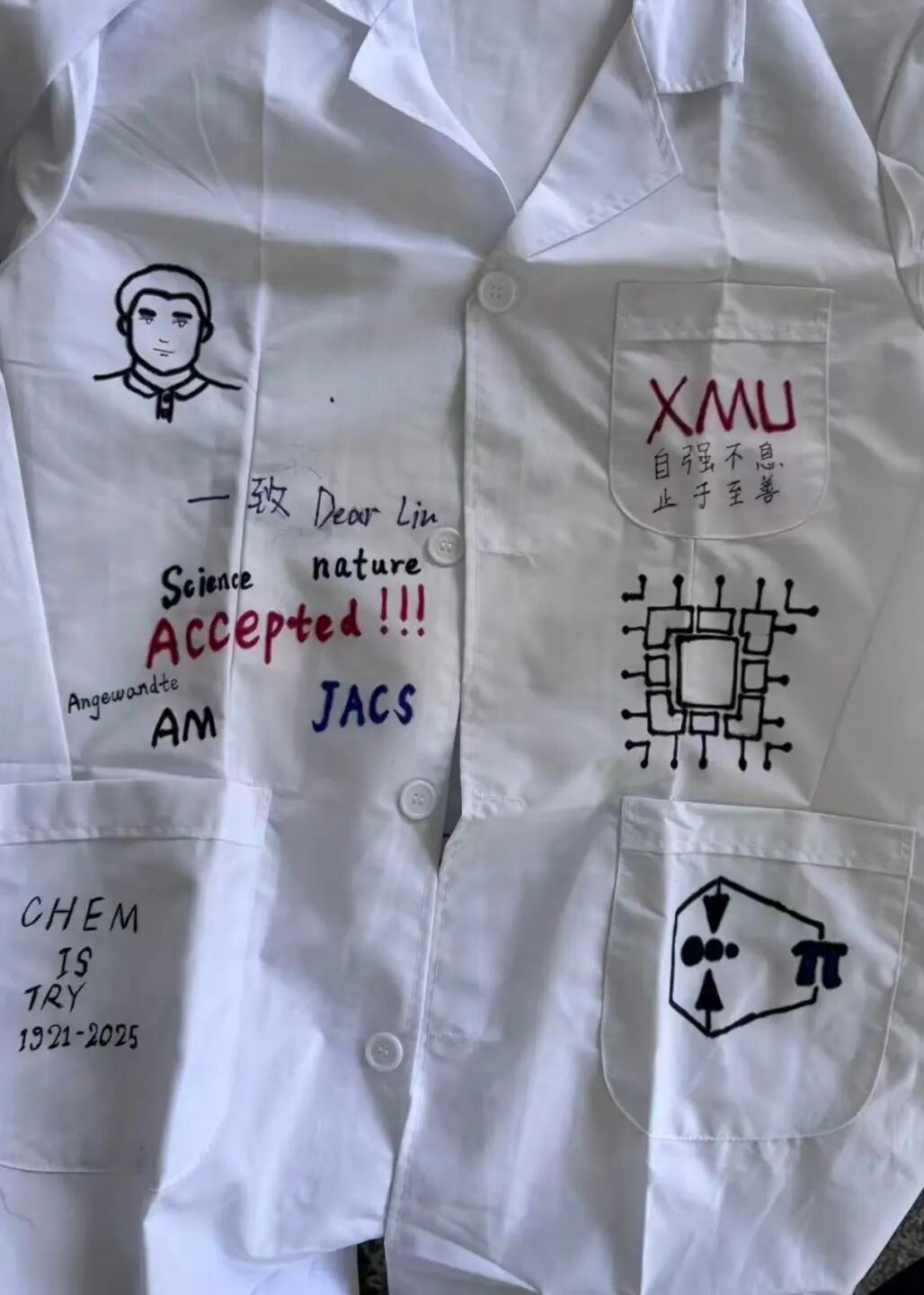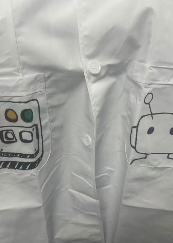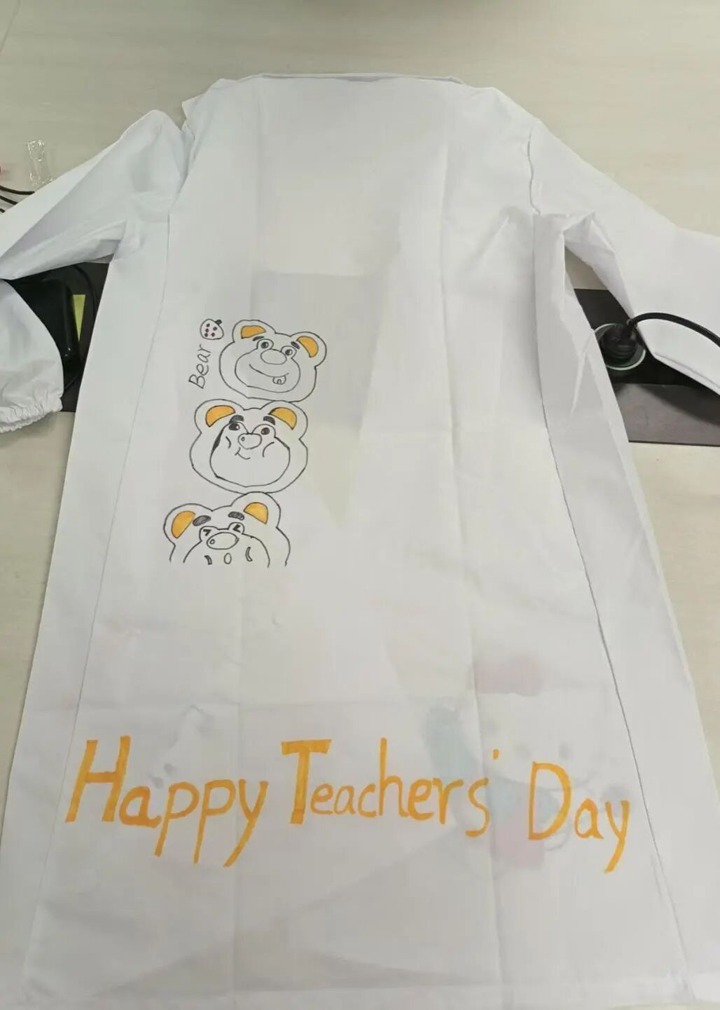 同学们拿起画笔,将老师的谆谆教诲、科研路上的点滴感悟,化作一个个充满创意的图案。同学们根据每个老师的特点以及兴趣爱好,为每位老师定制了不同的“战袍”,让每一件实验服都成为老师的"科研名片"。