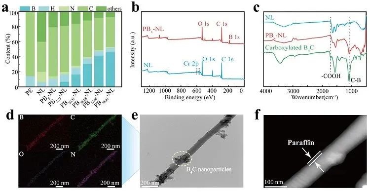 该研究使用聚丙烯酸树脂对碳化硼进行表面改性,成功向碳化硼纳米粒子的表面引入了带负电荷的羧基;以天然皮革中带正电荷的氨基及Cr3+等作为活性位点锚定碳化硼,从而分散功能元素;并利用纤维结构的两亲特性与石蜡发生作用,使石蜡在各级纤维表面包覆,形成纤维状的核–壳结构。根据表征结果可知,成功地通过分散及稳定功能元素,制得了富氢、富硼的天然皮革复合材料(图2)。