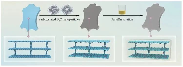 图1. 碳化硼/石蜡/天然皮革(PB-NL)中子防护材料的制备示意图