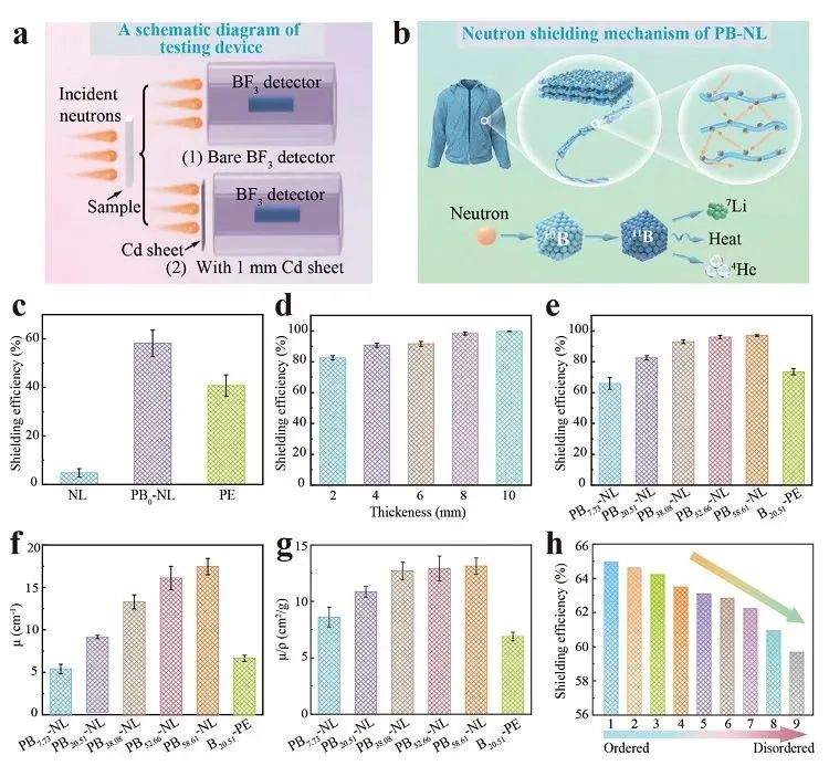 在PB-NL中,大量氢原子被负载在天然皮革的多层级纤维结构表面,这有利于诱导中子在这些结构中与氢原子发生反复多次的弹性散射,从而有效地耗散中子的能量;此外,PB-NL中的10B同位素可以和热中子发生10B(n,α)7Li核反应将其彻底吸收,并放出热量及氦气。通过这两种功能元素的协同作用,PB-NL展示出优异的中子防护性能,当碳化硼负载量达到58.61 mmol cm–3时,2 mm厚的复合材料对热中子的屏蔽能力高达96.93%,质量衰减系数高达13.13 cm2 g–1,两项指标均远优于碳化硼/聚乙烯对照样品(图3)。