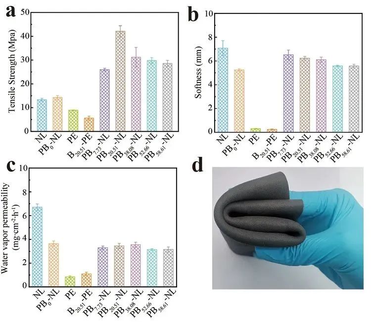 此外,由于天然皮革以三维多层级超分子组装结构作为材料的框架,而负载功能元素均未对天然皮革的原始结构造成改变,因此PB-NL充分保留了天然皮革机械强度高、透水气性好、柔软等优点,其各项指标均远优于聚乙烯基对照样品,表现出优异的可穿戴性能。