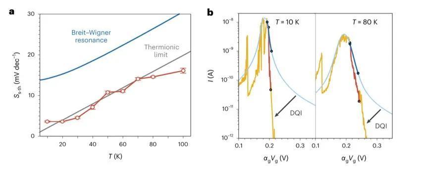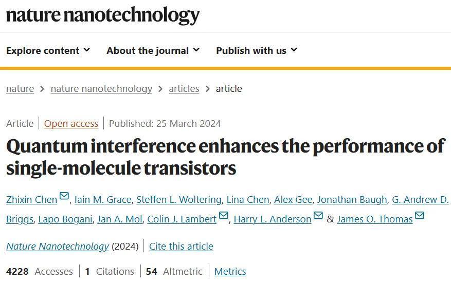 对此,牛津大学材料系博士后陈志昕(洪文晶课题组2019届毕业博士、2020届博士后)、牛津大学化学系Harry Anderson教授,兰卡斯特大学Colin Lambert教授,伦敦大学皇后玛丽学院James Thomas教授等使用单分子结合石墨烯电极,模拟CMOS结构构筑了新型单分子场效应晶体管,通过静电门控技术调控分子与石墨烯界面的DQI实现了极佳的亚阈值摆幅、极高的开关比、开关频率和循环寿命,证明了善加利用不可避免的量子效应可进一步增强纳米电子器件的性能。