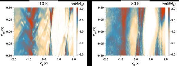 该研究首先进行了理论计算,分析了分子结的局部态密度(LDOS)。图2c上可见分子-石墨烯界面处出现局部态密度零点,说明DQI的存在。进一步分析透射谱图(图2d)可见在+0.25eV左右有一尖锐的DQI反共振信号。图2e展示了在80K温度下实验测得的微分电导(G)-栅压(Vg)曲线,其展现了一个与理论计算相符的反共振信号,证实了DQI的存在。进一步扫描微分电导(G)-栅压(Vg)-偏压(Vsd)的二维关系图可实现对量子干涉的完整测绘(图3)。其中在10K温度下的测绘观测到了电子干涉条纹,进一步证明了相干输运的机制(J. Am. Chem. Soc. 2023, 145, 15265–15274)。