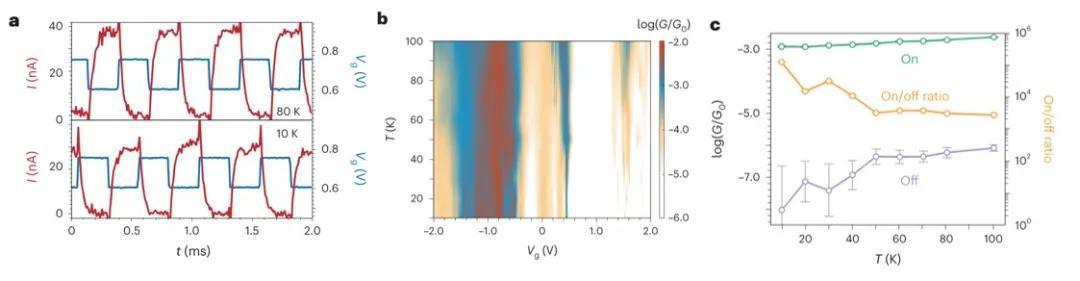 该研究进一步测试了该单分子晶体管性能的温度依赖性(图5),发现在测试温度区间内晶体管的开关比可达 10,000倍 ,开关频率>7 kHz(该频率受限于所用电流放大器带宽,实际可达到的频率应远高于此值,单电子极限下耦合为8 meV的单分子晶体管理论本征频率上限约为1THz)。如图6所示,在测试温度区间内,该晶体管的亚阈值摆幅(subthreshold swing,Ss-th)均达到了热电子极限(thermionic limit,CMOS晶体管的理论极限),以及>100,000 次开关循环性能稳定无任何衰减。