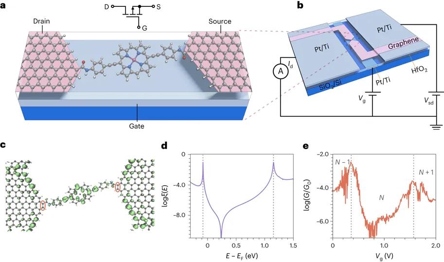 该研究使用了具有窄HOMO-LUMO能隙的锌卟啉分子核心,在相对的(5,15)meso位分别连接4-乙炔基苯胺基作为锚定基团。石墨烯源漏极由蝴蝶结形的石墨烯通过电烧(electroburning)的方法在空气中烧断构成,电烧的方法在石墨烯边缘留下氧化得到的羧基。分子锚定基团的氨基与石墨烯边缘的羧基可通过酰胺缩合反应形成共价键联,如图2a所示,形成分子结。该分子长度在2.5 nm左右。该分子结集成在微纳加工构筑的具有源(Source)、漏(Drain)、栅(Gate)三电极的场效应晶体管结构中,如图2b所示。