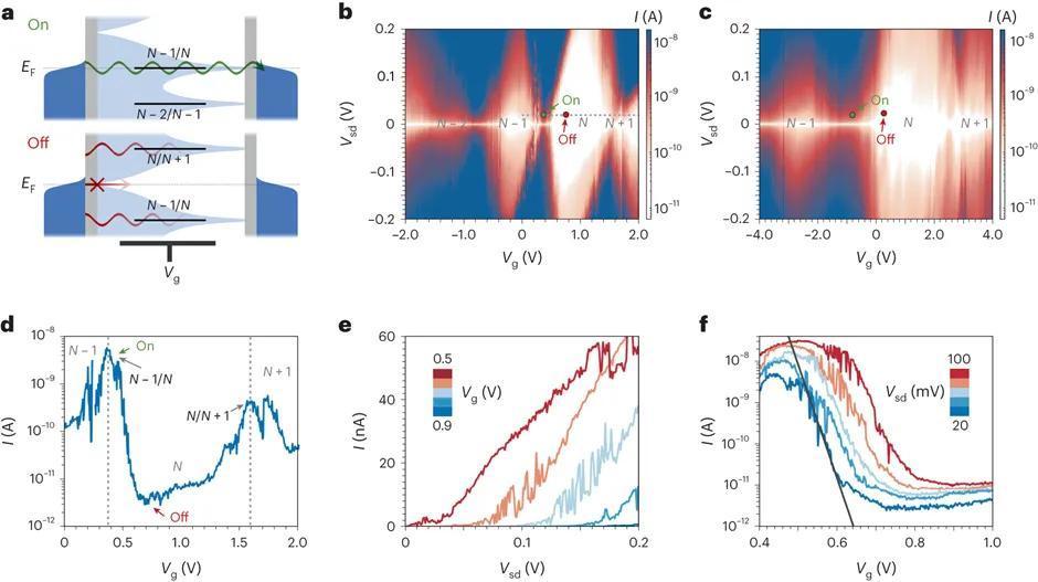 该研究使用分子HOMO轨道的共振隧穿(单电子氧化态和中性态间切换的转换,N-1/N)作为晶体管的开启态(ON),使用DQI的反共振信号附近作为晶体管的关闭态(OFF),来构筑晶体管(图4a-d)。