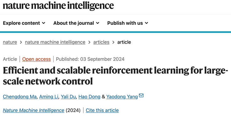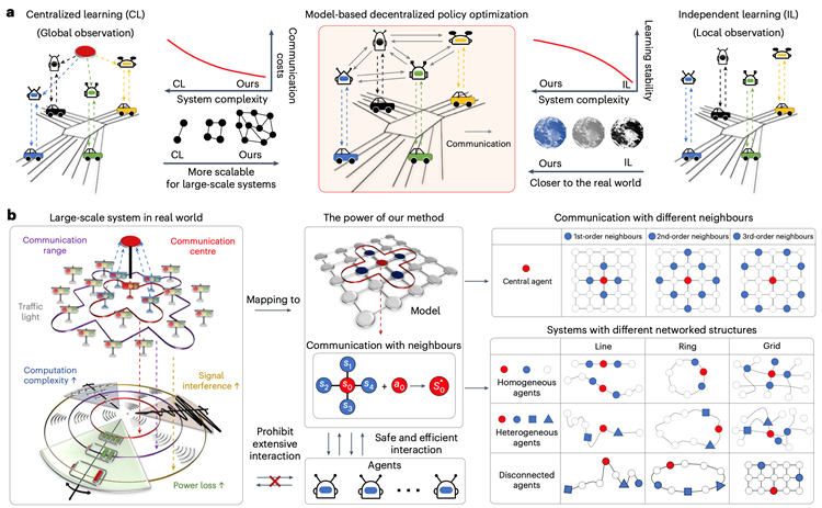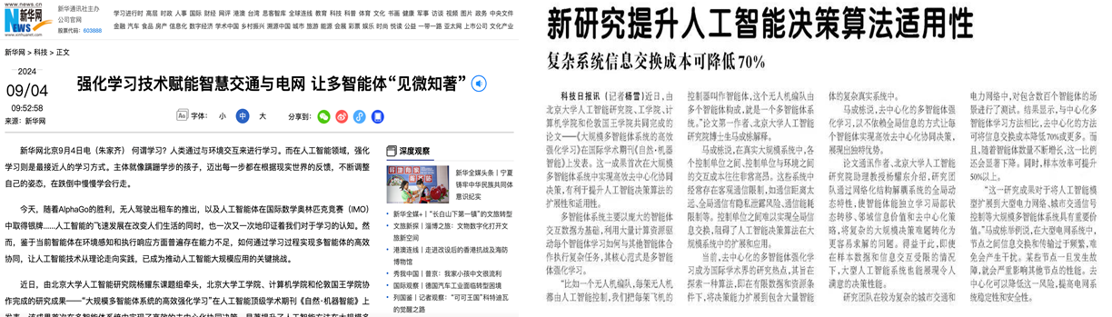 对此,北京大学人工智能研究院博士生马成栋(π-Lab 2023届毕业生,论文第一作者)、北京大学多智能体中心李阿明研究员,伦敦国王学院杜雅丽教授,北京大学计算机学院董豪助理教授和北京大学人工智能研究院杨耀东助理教授(论文通讯作者)提出了一种基于模型的去中心化策略优化框架,首次在数百个智能体级别的大规模多智能体系统中实现了高效的、可扩展的强化学习方法,显著提升了人工智能决策模型在大规模多智能体系统中的扩展性和适用性。该成果于近日发表于人工智能顶级学术期刊Nature Machine Intelligence,同时也被新华社,科技日报等权威媒体进行报道。这一成果也是华人领衔的多智能体强化学习(MARL)研究打破DeepMind在该领域多年来的垄断,首次登上Nature子刊。
